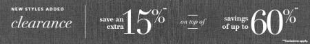 Stop by and save an extra 15% clearance items on top of savings of up to 60% in store for a limited time.