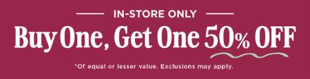 Limited time only! Shop in store and get buy one, get one 50% off sale.