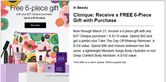 Now through March 21, receive a 6-piece gift with any $37 Clinique purchase.* A $118 value.