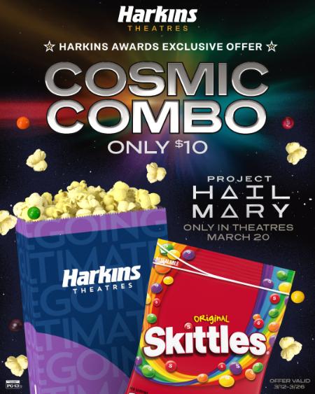 Harkins Awards Members can enjoy a Cosmic Combo with a small popcorn and Skittles for just $10 through March 26!