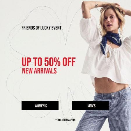 *Up to 50% Off Select Styles is valid from 12:01 AM PT, 3/18/2026 until 11:59 PM PT, 3/23/2026 in the US only. Offer is only valid at Lucky Brand Retail stores. Offer is not valid at Lucky Brand Outlet stores. Discount is automatically applied at checkout. Offer excludes items marked as Discounts Do Not Apply on Luckybrand.com, and products marked as Excluded From Promotions in-store. Cannot be combined with other discounts, promotions, nor employee discounts. This offer does not apply to previous purchases, applicable taxes, nor shipping and handling. Returns of any portion of the purchase will require equal forfeiture of offer or amount equal to offer. Not redeemable for cash or cash equivalent. Offer is not transferable. Lucky Brand reserves the right to extend, modify, eliminate, or reduce this promotion at any time.