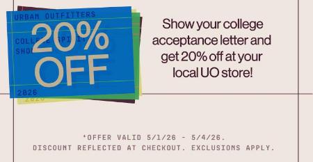 Stop by and show your college acceptance letter and get 20% off at your local UO store in store.